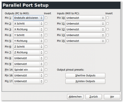 Im nächsten Dialog werden die einzelnen Pins des Parallelports konfiguriert. Die Vorgaben dazu findet sich jeweils im Handbuch zu den Steuerungsboards. Die Pins 1-9, 14, 16, 17 sind Ausgänge, die das Board mit den verschiedenen Takt- und Richtungsimpulsen, oder auch die Spindel, Kühlwasser oder das Aktivieren der Endstufen ansteuern. Die Pins 10-13, 15 sind Eingangssignale, die für die Endstops der Achsen und E-Stop (Notaus) verwendet werden. Bei den Enstops ist es wichtig zu wissen, dass wenn hier die Endstopps für alle drei Achsen konfiguriert wurden, vom Programm EMC nach dem Start ein „Homing“ (heranfahren an die Endstops) erwartet wird. Also die Endstops erst einzeln, dann alle zusammen konfigurieren.