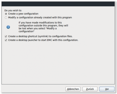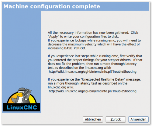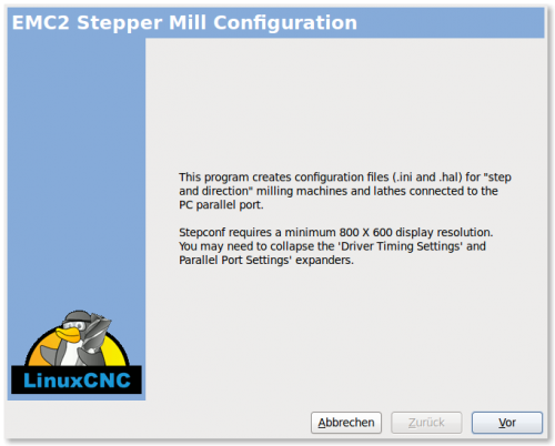 Ein Klick auf das Icon Stepconf auf dem vorbereiteten Desktop startet das Programm. Der erste Dialog hat nur informativen Charakter.