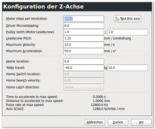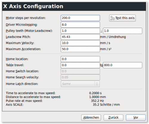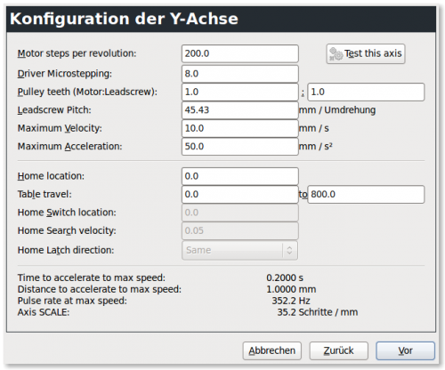 Im nächsten Schritt werden die Achen konfiguriert. Im Feld „Motor steps per revolution“ werden die Schritte des Motors für eine Umdrehung eingestellt. Die Anzahl ist eine Konstruktionsmerkmal des Motors, das auch gerne als Winkel angegeben wird. Ein Winkel von 1,8° entspricht 200 Schritte/Umdrehung (200*1,8°=360° = eine Umdrehung). 0,9° dann 400 Schritte/Umdrehung usw. Die gebräuchlichsten Motoren haben 200 Schritte. Diese hier also eintragen.