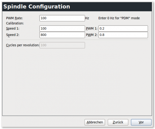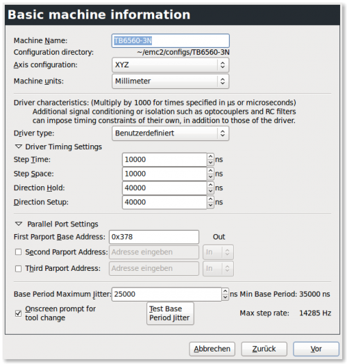 Der nächste Dialog ist schon anspruchsvoller. Hier ist für die Konfiguration ein eindeutiger Name zu vergeben. Man kann hier natürlich auch den Namen der Fräse (z.B. Shapeoko2) vergeben, an dem die Steuerung fix angebracht ist. Bei Achsen-Konfiguration wählen Sie bitte die gewünschte Konfiguration, meist XYZ für eine Portalfräse. Die Maschineneinheiten sind, in Deutschland, meist mm. Es ist auch inch möglich. Dann sind alle weiteren Angaben in mm oder inch zu verstehen. Treibertyp bleibt „Benutzerdefiniert“. Nun wird es etwas kniffliger. Die folgenden Werte beschreiben die Impulscharakteristik für die Schritt- und Richtungsimpulse. Abhängig von den verwendeten Kondensatoren für die TB6560 Bausteine sind für einen Schrittimpuls 10µs (=10000ns) oder weniger notwendig. Als Startwert sind 10000ns ganz gut. Wenn erstmal alles läuft, kann hier experimentiert werden und der Wert 1000ns weise reduziert werden. Das Gleiche gilt für den Abstand zwischen den Impulsen, die Haltezeit für den Richtungsimpuls und die Vorlaufzeit des Signals für einen Richtungswechsel. Die hier angegebenen Zeiten funktionieren mit den meisten Chinaboards, so auch mit unserer. Standardmäßig ist der Druckerport auf der Speicheradresse 0x378. Das kann auf dem PC-Mainboard im BIOS nachgeprüft werden. Hier kann auch gleich überprüft werden, ob der Port überhaupt aktiviert ist oder nicht. Das ist übrigens einer der häufigsten Fehler, warum ein Chinaboard nicht beim ersten Versuch funktioniert. Als nächstes wird die Frequenz festgelegt, mit der die Schrittimpulse max. erzeugt werden können. Dazu ist zuvor ein Testprogramm mit dem Button „Test Base Period Jitter“ zu starten. Es öffnet sich ein kleines Fenster in dem Zahlen in drei Spalten und zwei Zeilen dargestellt werden. Während das Programm verschiedene Zeiten misst, sollte der PC z.B. mit einem Dateitranfer oder intensiver „sinnloser“ Internetnutzung mit dem Webbrowser (z.B. Youtube-Video) ausgelaste werden. Nach einer selbst festgelegten Zeit kann man dann den fett gedruckten Wert in der Mitte, aufgerundet auf glatte 1000der in den vorherigen Dialog übernehmen. Dazu das „Messprogramm“ beenden. Es errechnet sich dann unten rechts die max. erzielbare Taktfrequenz.