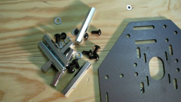 Für den Zusammenbau werden die sechs Abstandsbolzen auf einer Platte mit den M5 Schrauben und Unterlegscheibe festgeschraubt. Dann die gegenüber liegende Platte mit den restlichen sechs Schrauben und Unterlegscheiben festgeschraubt. Die Abstandsbolzen haben ein sechskant Profil, so dass sie mit einem 8 mm Maulschlüssel beim Zusammenschrauben gehalten werden können.