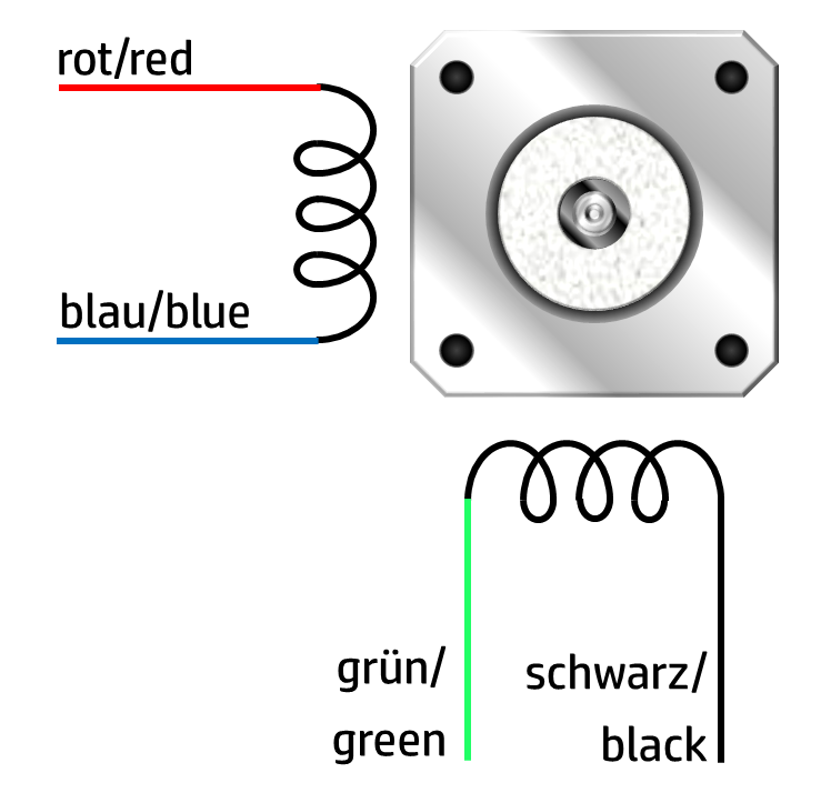 Das andere Ende des Motorkabels schließe ich an die Lüsterklemmen an, mit denen ich die Kabel der Motoren verbinde. Die bei mir gelieferten Motoren sind vom Typ 42BYGHW811. Die Kabelpaare der Spulen sind dabei Rot-Blau und Schwarz-Grün. Andere Motoren können eine andere Farbcodierung haben. Dann muss man mit einem Durchgangsprüfer die jeweiligen Paare identifizieren, da die Spule einem Gleichstrom so gut wie keinen Widerstand entgegen stellt. Hier noch eine graphische Darstellung der Spulen: