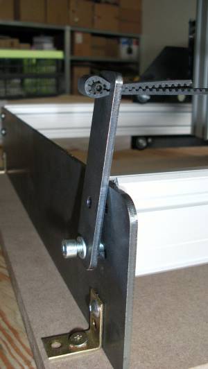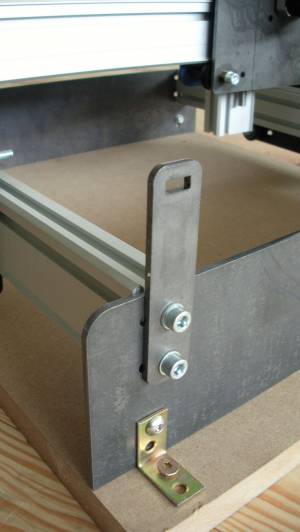 Ein Zahnriemenspanner kann bereits komplett festgeschraubt werden. Z.B. auf der Rückseite. Die M5x20 mm Schraube wird dabei durch den Zahnriemenhalter und durch das Rahmenblech in dem MakerSlide Profil hineingeschraubt.