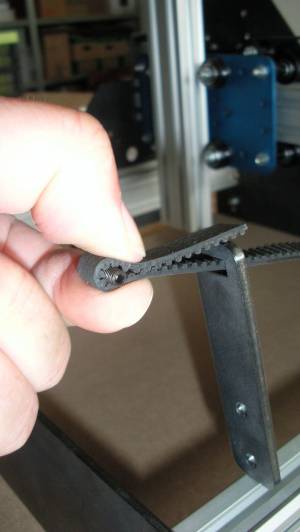 Der Zahnriemen muss so eingestellt werden, dass der Zahnriemenhalter leicht schräg bleibt, wenn der „leicht“ gegen das Rahmenblech gedrückt wird. Wenn das nicht der Fall ist, muss die vorherige Prozedur für den vorderen Zahnriemenbalter widerholt werden. Dabei werden die beiden Zahnriemen dann um einen Zahn weiter nach hinten ineinander geschoben und der Zahnriemenhalter wieder über beide Zahnriemen geschoben. Das Versetzen um einen Zahn muss so lange widerholt werden, bis der Zahnriemenhalter so wie Abgebildet einen leichte Winkel zum Rahmenblech aufweist.