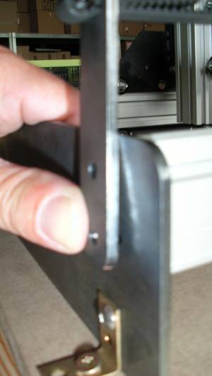 Danach die untere Schraube durch den Zahnriemenhalter und das Rahmenblech durchfädeln. Die Schraube leicht anziehen. Bevor die Schraube festgezogen wird, muss der Laufwagen (Gantry) ganz nach vorne geschoben werden, damit sich die Abstände der beiden MakerSlide Profile der Y-Achse gegeneinander ausrichten können. Dann die Schraube festziehen und dann die zweite Schraube einstecken und festziehen.