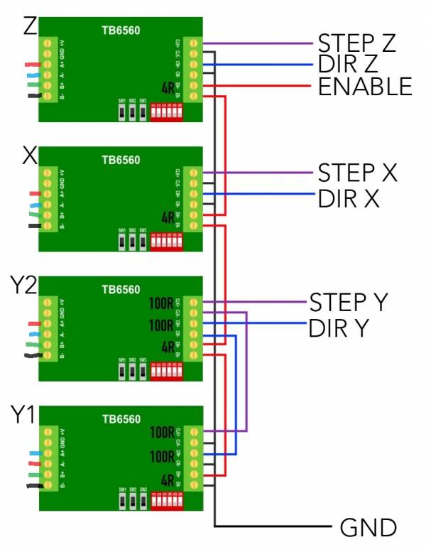 Für die übliche Shapeoko Konfiguration mit doppelter Y-Achse ergibt sich folgende Verkabelung: