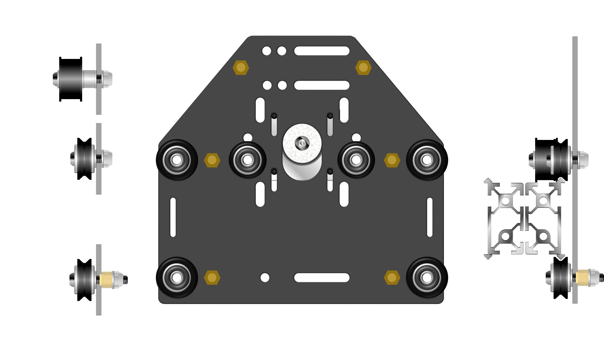 Die Exzenterschrauben dienen dazu, den Abstand zwischen den V-Lagern zu verändern. Testweise sollte man ein Makerslide vorsichtig zwischen den Lagern einführen und die Exzenterschrauben so verdrehen, dass die Öffnung maximal ist. Das Aluminiumprofil sollte frei zwischen den Lagern laufen. Nun verstellt man die Exzenterschrauen so, dass die V-Rollen gerade nicht mehr frei drehen.