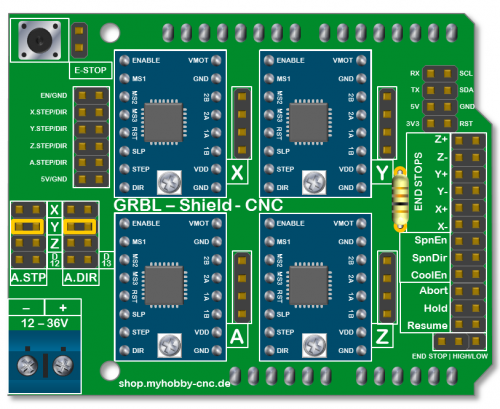 Die Shapeoko2 wird über ein Arduino gesteuert. Um die Motoren zu treiben verwendet der Bausatz ein Shield (hier die Version 1.01 abgebildet), welches vier Pololu A4988 Schrittmotortreiber trägt, welche die vier Motoren ansteuern.